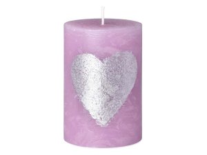 Rustikálna sviečka valec v sv. fialovej farbe + srdiečko lak 70x100 mm