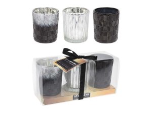 Súprava troch sklenených svietnikov – kombinácia čiernej, striebornej a šedej.