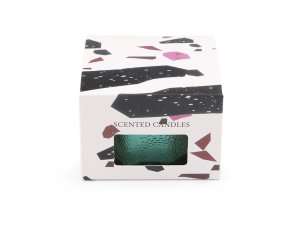 Vonná sviečka v skle s dekoratívnym reliéfom pripomínajúcim krištáľ vrátane viečka.