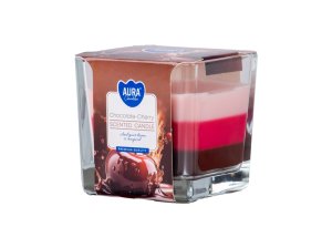 Vonná sviečka v skle. Sviečka má ovocnú vôňu brusníc, ktoré sú vyobrazené aj na potlači.