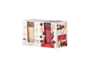 Vonná sviečka v skle balená v krabičke s potlačou.