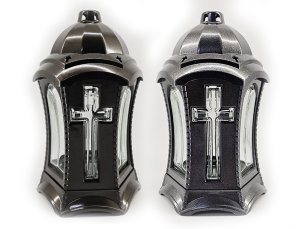 Cintorínska lampa v podobe lucerny kombinuje materiály sklo a plast.