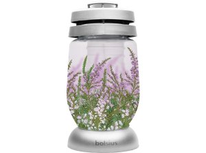 Cintorínska lampa ozdobená obrázkami vresu, s viečkom a podstavcom v striebornej farbe.