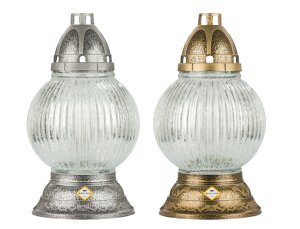 Sklenený cintorínsky lampáš v tvare banky s výškou 17 cm.
