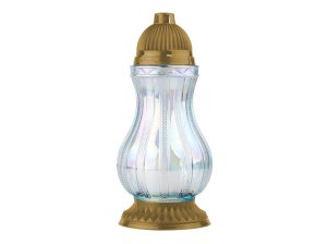 Cintorínska lampa s čírym sklom zdobeným krížikom, so zlatým plastovým viečkom.