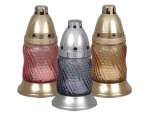 Plastová cintorínska lampička plnená, so zdobeným kovovým viečkom.