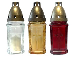 Sklenená cintorínska lampa v tvare kríža, s reliéfnym vzorom, s náplňou naliatu priamo v lampe.