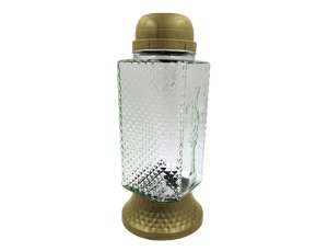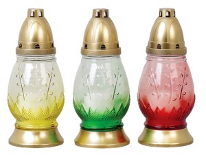 Sklenená náhrobná lampička so zlatým plastovým viečkom.