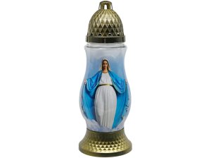 Plastová cintorínska lampička plnená, so zdobeným kovovým viečkom.