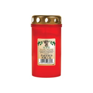 doba horenia: 40 hod. výška: 12 cm hmotnosť: 120 g parafín materiál: plast farba: biela, červená Cintorínska sviečka 12 cm s ochranným viečkom proti dažďu a proti uhaseniu plamienka vetrom.