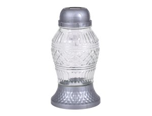 Cintorínska lampa v podobe lucerny kombinuje materiály sklo a plast.
