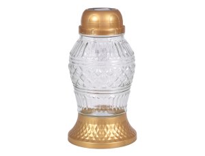 Sklenená náhrobná lampa so zlatým plastovým viečkom.