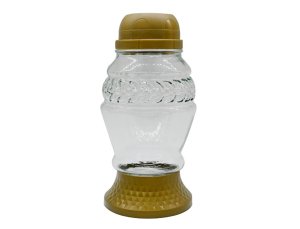 Sklenená cintorínska lampa ozdobená krížikom. Číre sklo s plastovým viečkom tvorí tradičnú, obľúbenú kombináciu.