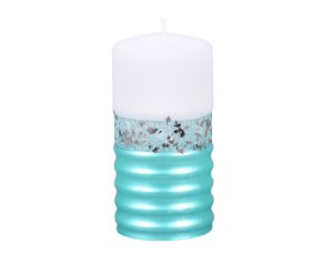Sviečka v tvare valca. Jej vzhľad je tvorený tromi časťami - prvá je hladká, druhá s glitrami a tretia metalická, vlnitá.