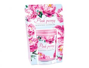 Vonná sviečka v skle s papierovou etiketou a papierovým prebalom, zdobené bohatými kvetmi ružových pivoniek.