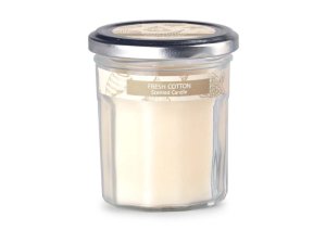 Vonná sviečka v skle s jemnou potlačou a sviežou vôňou bavlny.