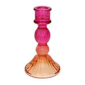 Sklenený, strojne vyrábaný svietnik so súdkovito tvarovanou stopkou.
