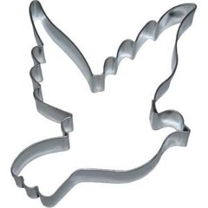 Vykrajovač z pocínovaného plechu v tvare holubičky s rozmermi 9,2 x 8 centimetra.