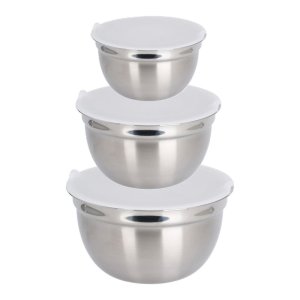 Súprava misiek z nerezovej ocele s viečkami – 3 ksPraktická sada misiek z odolnej nerezovej ocele 14/1, ideálna na skladovanie potravín, prípravu jedál alebo servírovanie.