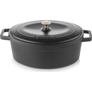 Pekáč liatinový EXCELLENT oválny s vekom s objemom 3 + 4 la rozmeru 39 x 26 x 14 cm v čiernej farbe.