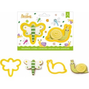 Súprava dvoch plastových vykrajovačov v tvare vážky a slimáka.