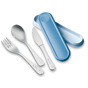Príbor z nerezovej ocele v plastovom puzdre, obsahuje menšiu lyžicu, nôž a vidličku - dĺžka príboru je 15,5 cm.