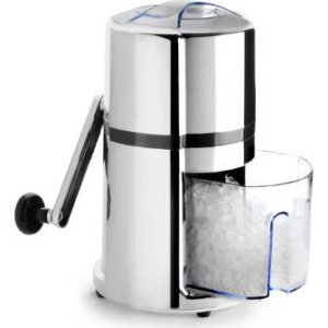 Ručný drvič ľadu z nerezovej ocele s plastovým zásobníkom.