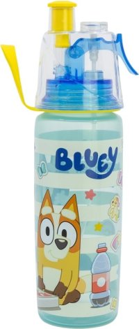 Detská plastová fľaša na vodu s náustkom a rozprašovacím tlačidlom.
