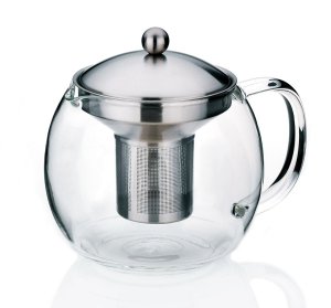 Sklenený čajník s nerezovým sitkom, filtrom a telom kanvice.
