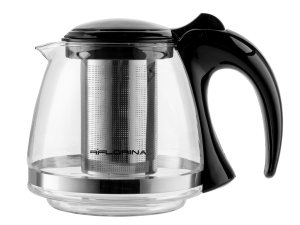Sklenený čajník s nerezovým sitkom a plastovou rúčkou.
