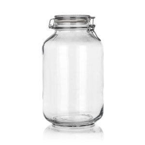 Sklenená hermetická dóza FIDO 4 l číra so skleneným viečkom a kovovým zatváracím patentom, viečko je osadené gumovým tesnením.