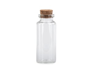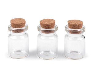 Sklenená fľaštička s korkovým uzáverom sa dá využiť na skladovanie drobných predmetov ako sú perličky, glitre, flitre a pod.