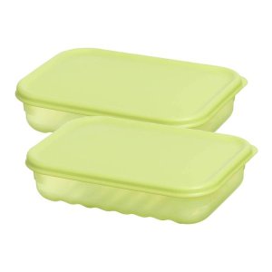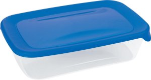 Hranatá plastová krabička vhodná na uchovanie potravín. Štvorcový pôdorys.