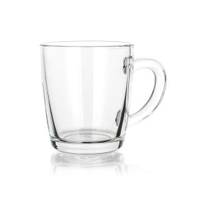 Elegantný hrnček Basic s objemom 330 ml, vyrobený z číreho hladkého skla Rozmery: priemer - 8,7 cm, výška - 9,8 cm