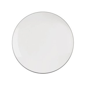 Elegantný porcelánový dezertný tanier má hladký biely povrch a je zdobený jemnou čiernou linkou po okraji, ktorá podčiarkuje jeho vycibrený vzhľad.