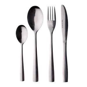 24dielna sada príborov DESMA. Sada obsahuje: 6x polievkovú lyžicu, 6x vidličku, 6x jedálenský nôž a 6x čajovú lyžičku.