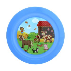 Tanier detský plytký 21 cm, FARMA, PH mix farieb. priemer: 21 cm materiál: plast mix farieb: biela, žltá, svetlo modrá, zelená Detský plastový tanierik s potlačou - dekor FARMA - určený pre menšie deti.