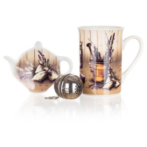 Hrnček 340 ml LAVENDER, tácka keramický, čajítko nerez, sada 3diel.