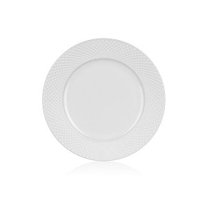 Plytké taniere Banquet Diamond Line v bielej farbe s ozdobným reliéfom Vyrobené z keramiky, s priemerom 27 cm Možno použiť do mikrovlnnej rúry aj do umývačky riadu na bežné domáce použitie Sada obsahuje 6 …