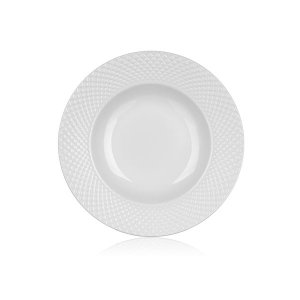 Hlboké taniere Banquet Diamond Line v bielej farbe s ozdobným reliéfom Vyrobené z keramiky, s priemerom 22,2 cm Možno použiť do mikrovlnnej rúry aj do umývačky riadu na bežné domáce použitie Sada obsahuje …