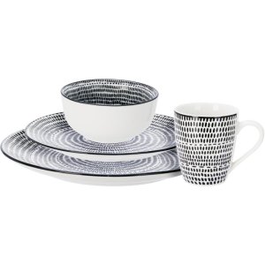 Jedálenská súprava 16 dielov – porcelánElegantná jedálenská súprava z kvalitného porcelánu s jemným červeným prúžkom a čiernou tlačou zvonku.