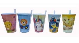 Kvalitný plastový pohárik 500ml (po horný okraj) s integrovanou slamkou a detským dekorom.