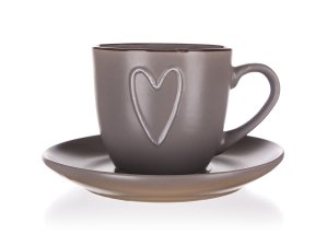 Šálka + podšálka, 260 ml, HEART, keramický HN. objem: 260 ml priemer šálky: 8,6 cm výška šálky: 7,6 cm priemer podšálky: 14 cm materiál: keramika farba: hnedá dekor: srdce Šálka HEART s tanierikom, s dekorom …