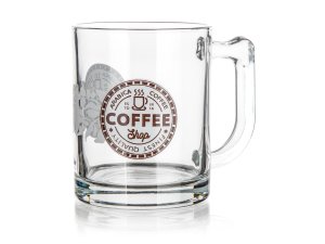 Sklenený hrnček VALUE s dekórom Káva s objemom 345 ml.