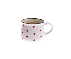 Hrnček 450 ml, bodky, vysoký, keramický ČRV. objem: 450 ml priemer: 8,5 cm výška: 14,5 cm materiál: keramika Vysoký červený hrnček s bodkami.