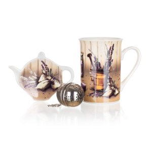 Hrnček 340 ml LAVENDER, tácka keramický, čajítko nerez, sada 3diel.