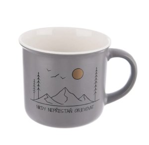 Dekorovaný hrnček NIKDY NEPRESTAŇ OBJAVOVAŤ s uchom.