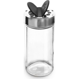Sklenená dóza na korenie vyrobená z kombinácie kvalitného skla a kovu, odolná proti poškodeniu a opotrebovaniu.