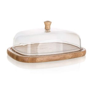 Dóza na maslo a syry BRILLANTE s rozmermi 17,4 x 12,4 x 6,2 cm, podnos s ryhou z kvalitného gumovníkového dreva, poklop acryl s dreveným knobom.