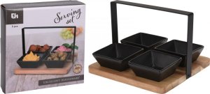 - servírovací set misiek a podnosu pre najrôznejšie príležitosti- materiál: kamenina s matnou glazúrou- podnos z akáciového dreva s pripravenými otvormi pre misky, mištičky vďaka tomu drží na mieste- jednoduché …